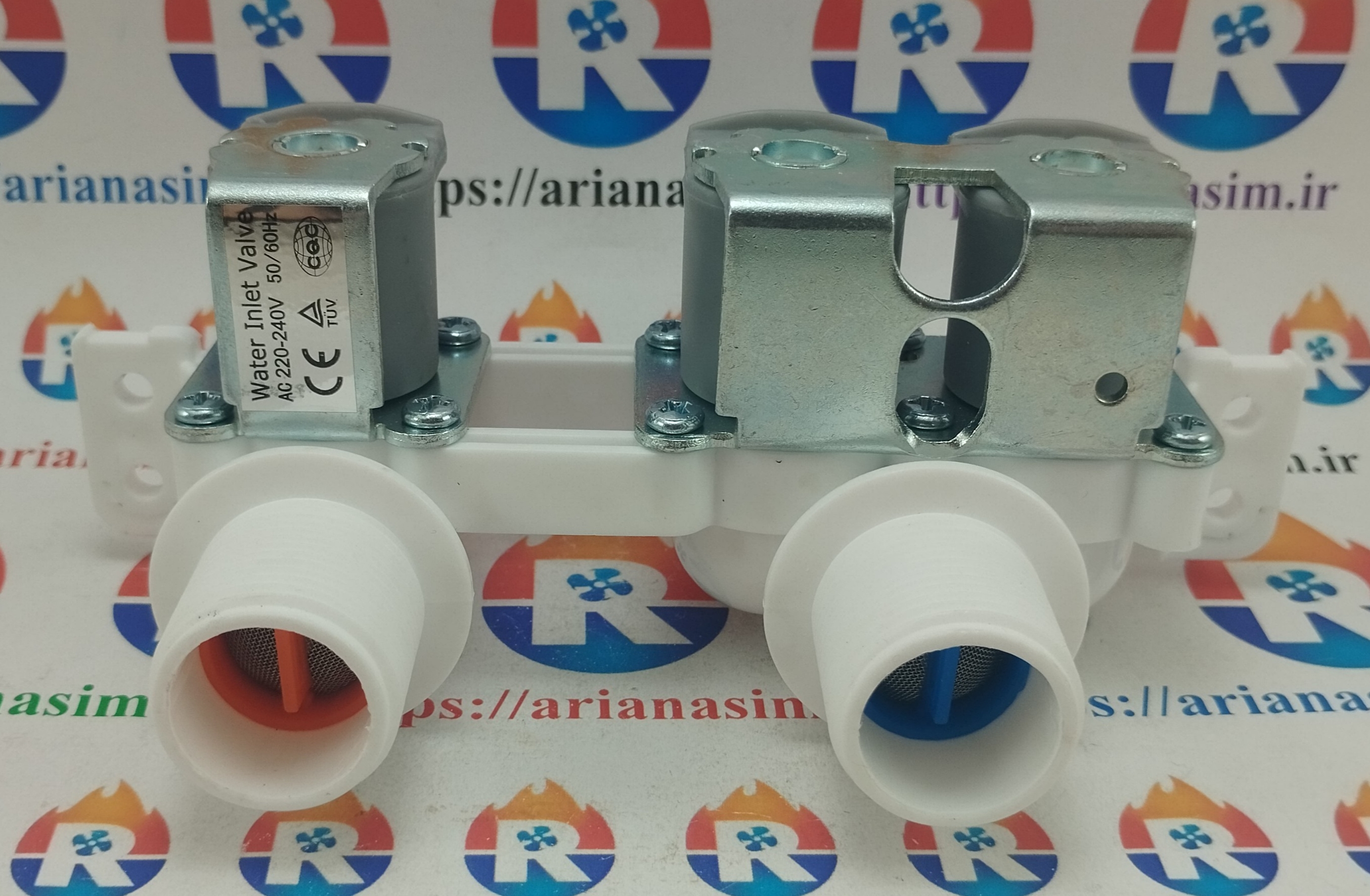- شیر برقی دو بوبین: این مدل شیر برقی از دو بوبین و دو مسیر برای ورود آب برخوردار است. در ماشین لباسشویی های جدید معمولا از شیرهای برقی دوقلو یا سه قلو استفاده می گردد.