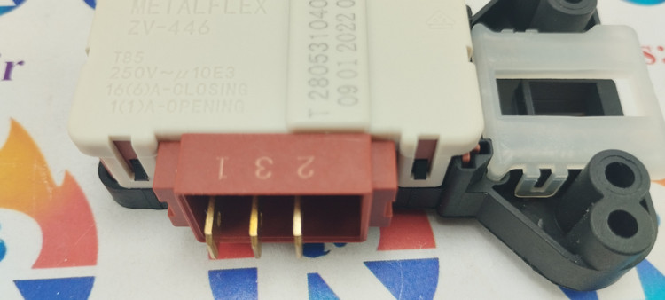 - برای تست میکروسوئیچ لباسشویی، 2 تا پایه که عدد بزرگتری دارند را برق مستقیم دهید و زبانه درب را با پیچ گوشتی فشار دهید.
